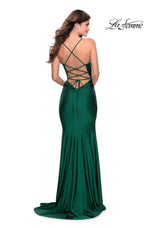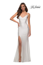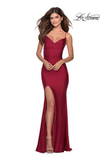 Simple yet super classy is this long evening gown by La Femme. 28518, features a draped cowl v-cut neckline, a slim fitting silhouette made of jersey fabric that will smooth out your curves. With a finishing touch of an open lace-up back and a thigh high leg slit. Wear this gown to any Gala, Prom 2020, or social occasion!