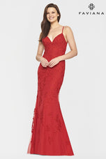 Summer and Fall vibes give off this beautiful beaded laced on tulle fit and flare by Faviana. S10508 showcases a sexy v-neckline and thin straps that form an open lace-up back. The fitted silhouette will hug you perfectly. A sweep train completes the gown! Perfect HoCo dress, winter formal dress or banquet dress!