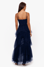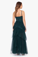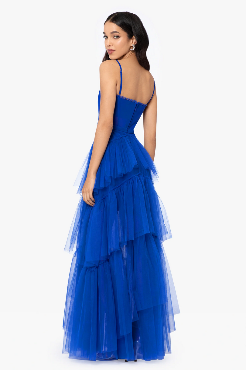 Indulge in a night of enchantment with the Betsy and Adam A24201 prom dress. This long and romantic gown is designed to make you feel like a true princess on your special night. The dress features exquisite ruffle detailing that cascades down the skirt, adding a touch of whimsy and movement. Each ruffle creates a stunning visual effect, giving the dress a fun and playful vibe. With its corset bodice, this dress ensures a perfect and adjustable fit, accentuating your curves in all the right places. The corset adds a hint of allure and adds to the overall romantic aesthetic of the gown. Crafted with utmost care and attention to detail, the Betsy and Adam A24201 dress is made to make a statement. The combination of the long length, ruffles, and corset creates a mesmerizing look that will leave a lasting impression.