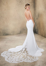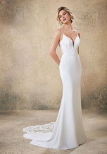 Sexy and shear in all the right places, Rasia is a boho-inspired sheath bridal gown from the Fall 2019 Blu by Morilee Bridal Gown collection. Imagine this head-turning look at your destination wedding or beach wedding! Featuring a fabulous, long illusion train, we're also loving the sheer side panel cut outs and sexy, low, illusion back. Delicate and comfortable straps paired with a plunging sweetheart line make this crepe dress a perfect look for the bride who is ready for all the attention her big day will bring! Please call our Dallas, Texas location to check in-store availability, pricing and current ship dates.
