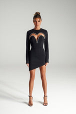 Embrace your uniqueness in this unforgettable short gown created by Portia and Scarlett from The Black Collection, PS325B. Feel sexy in the slim fitting gown that features a keyhole top on the plunged sweetheart neckline and long sleeves. The slim fitting skirt is completed with a side detail! Pair this with a pop of color or keep it classy with silver accessories!