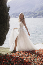 The Abella Spring 2024 bridal gown is a delightful combination of fun and elegance, embodied beautifully in Pallas. This ballgown design comes with a surprising twist, featuring a stylish slit that adds a touch of flirty charm to your bridal look. The square neckline with straps exudes a modern and playful vibe, while the floral lace motifs bring a sense of timeless romance. Inspired by European design, the gown sparkles with an exquisite touch, making you feel like a true princess on your special day. This dress is perfect for the bride who wants to capture a sense of whimsy and enchantment while maintaining a European-inspired grace.