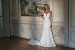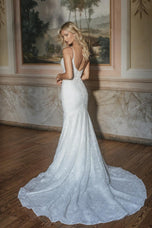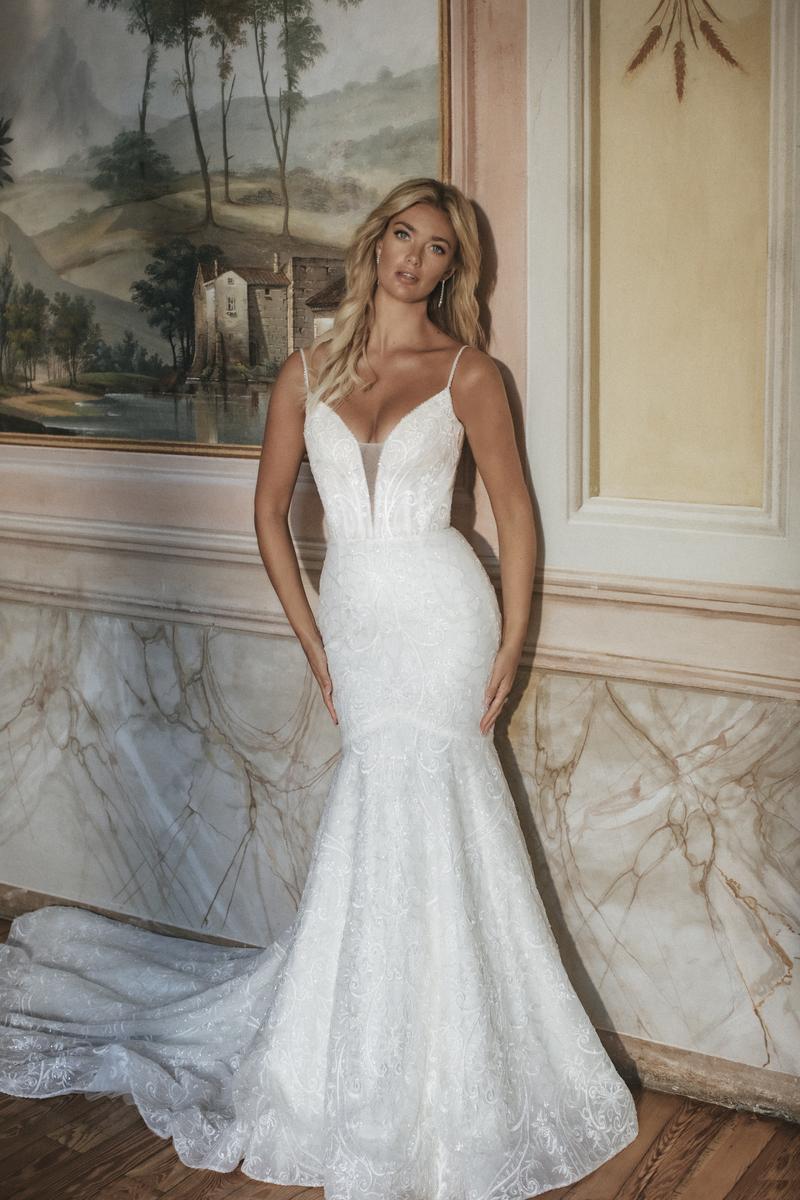 Shimmer and shine in this glitter glam bridal gown from the Spring 2024 Abella Bridal Gown collection. Lynx is both structured and soft, with sequins and embroidered lace trailing across the gown's strappy, fit and flare silhouette. We're imagining her floating down the aisle lit up by stars at your outdoor reception or chandeliers at a formal reception. Finished with a plunging v-neckline and low v-back.