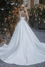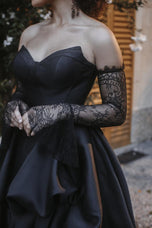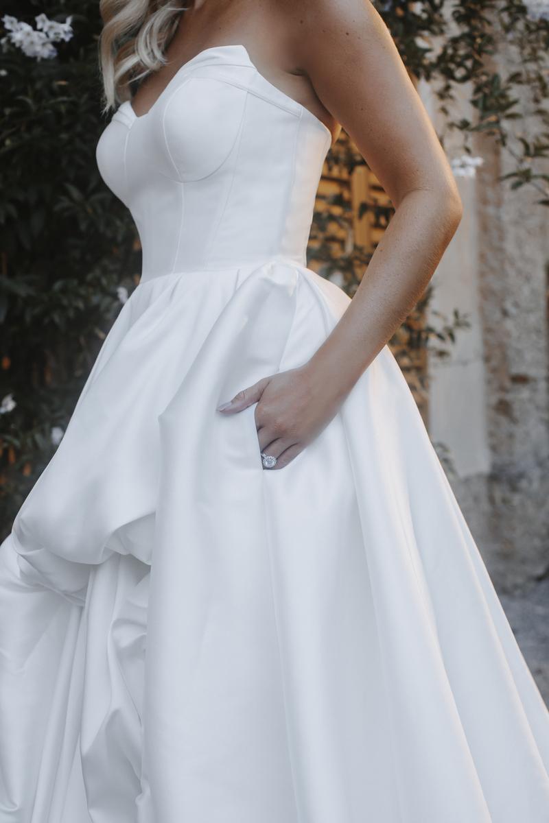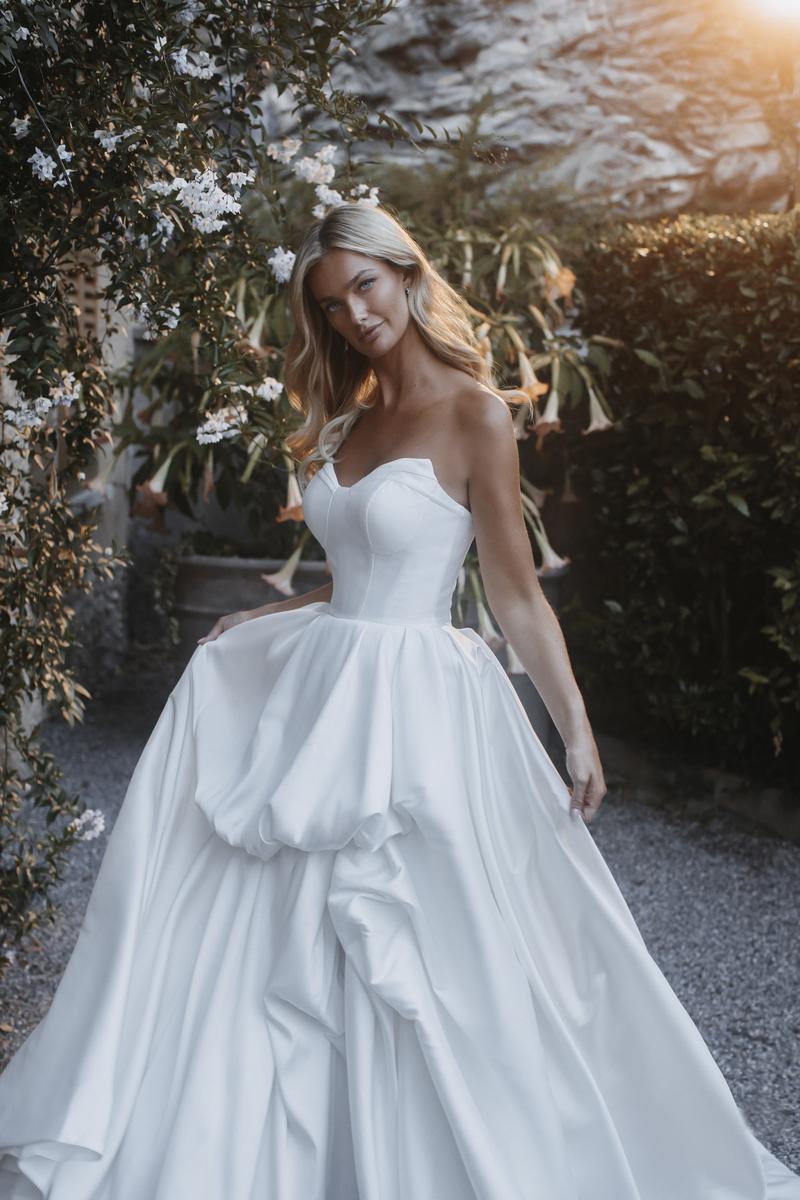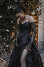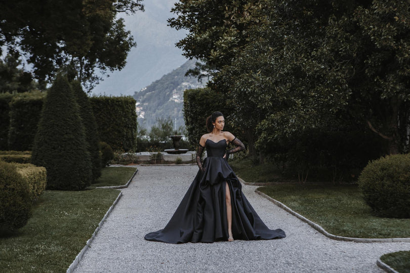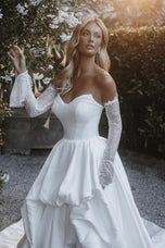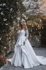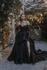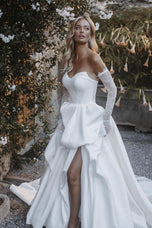Light plays beautifully over Nova's jaw-dropping Mikado ballgown silhouette, designed for the Spring 2024 bridal gown collection. Chic and minimalist, accented only by a dramatic gathered skirt and optional contrasting lace sleeves, we're loving her sophistication on modern edge. For the truly fashion-forward bride, we can think of nothing better for your formal wedding or stunning outdoor bridal setting. Finished with a geometric neckline and demurely sexy thigh-high slit.