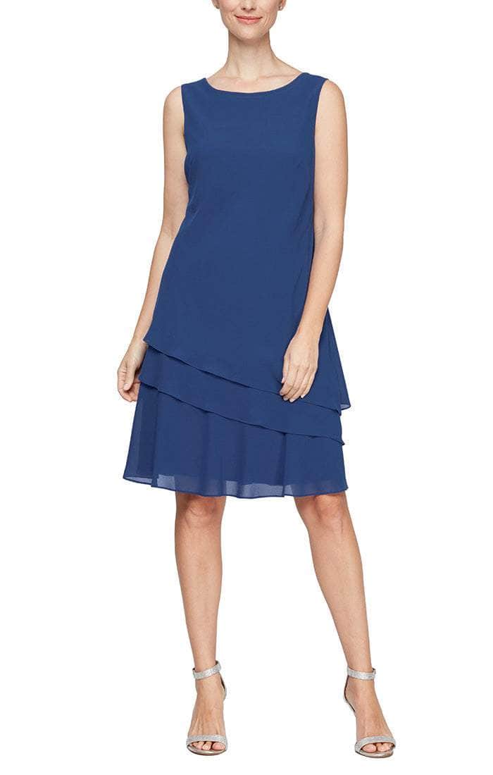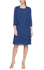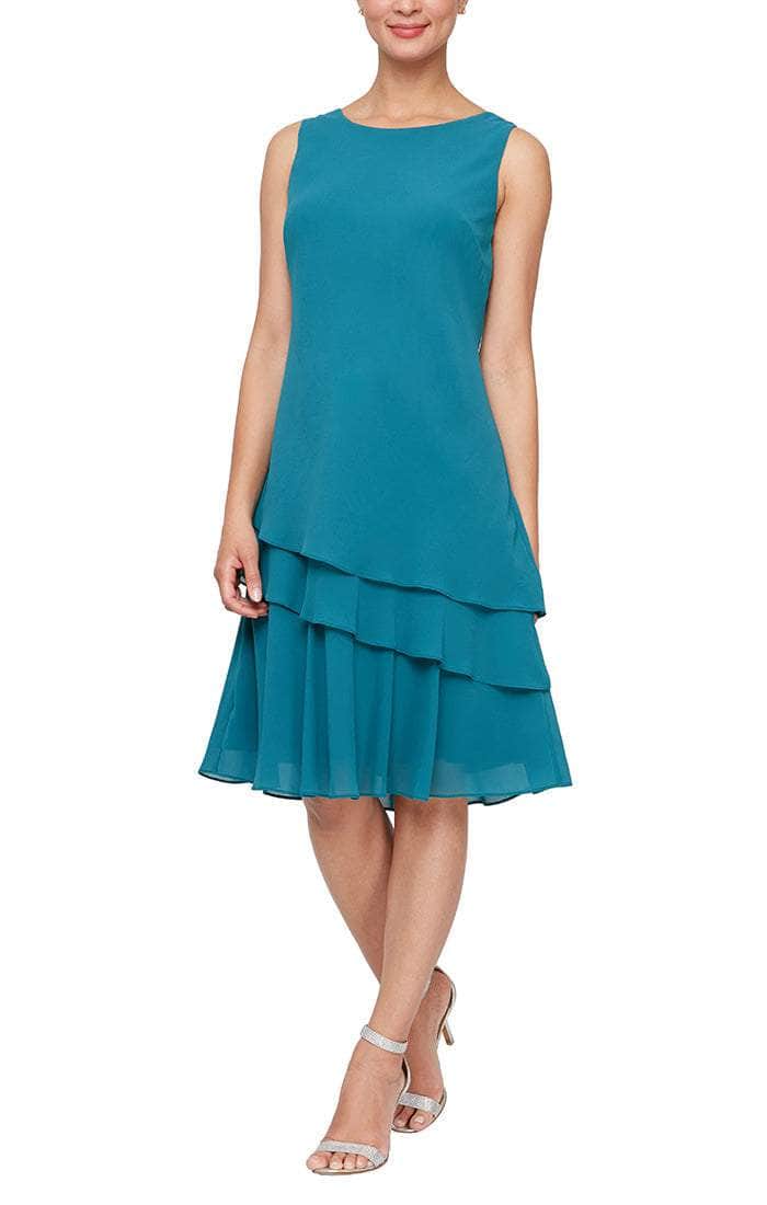 Discover your perfect match in this elegant Alex Evenings 8192005 dress. Crafted from beautifully tailored chiffon, this knee-length design features a sleeveless scoop neck inner that slips on easily and is fully lined, creating a flattering A-line silhouette with a stylish tiered hem. The fitted tea-length style is complemented by a chic quarter-sleeve open jacket, enhancing your look. Embrace your inner royalty in this stunning Alex Evenings masterpiece. Available in Pinkberry, Royal, Teal, and Wedgewood colors. This dress is a final sale. No Returns or Exchanges.