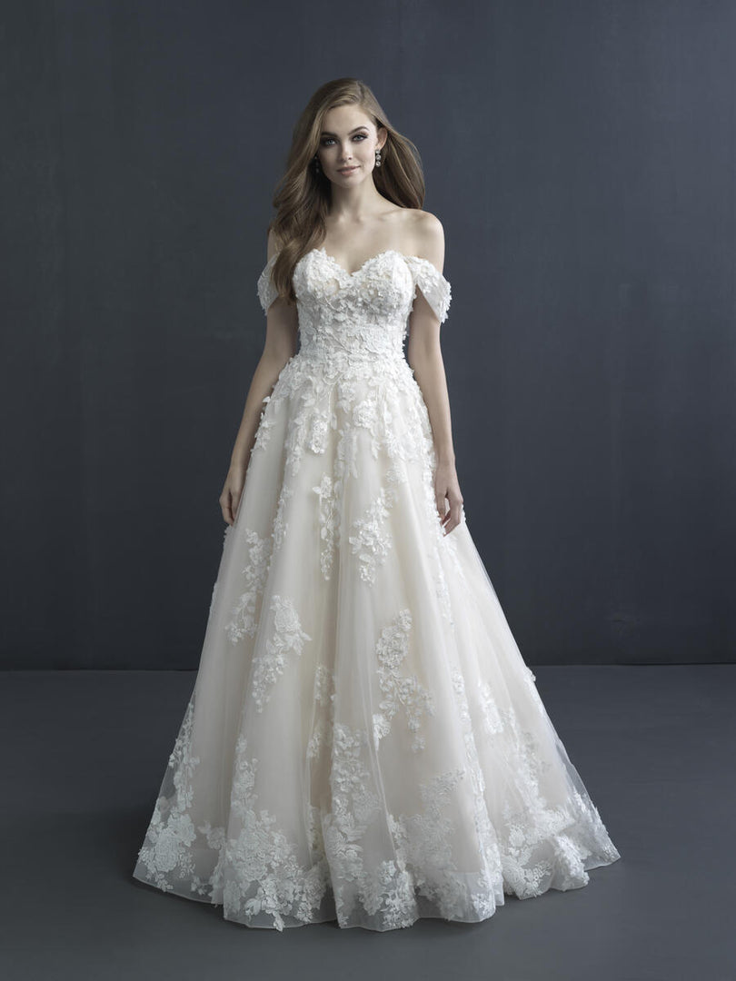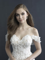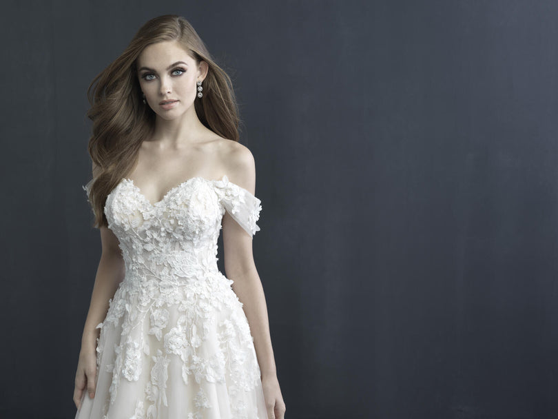 An off the shoulder dream dress for a princess bride, this is style C603 from Allure Coutures 2021 Bridal Gown collection. Textured blooms add movement and endless charm to this fairytale-worthy ballgown, a fabulous addition to your formal church wedding or whimsical outdoor ceremony. A flattering sweetheart neckline is paired with draping, off the shoulder details to make this bridal gown truly awe-inspiring! Flirty and floral, a full skirt completes the look, perfect for any body type from apple to hourglass to pear-shaped! Please call our Dallas, Texas location to check in-store availability, pricing and current ship dates.