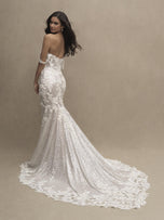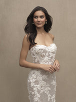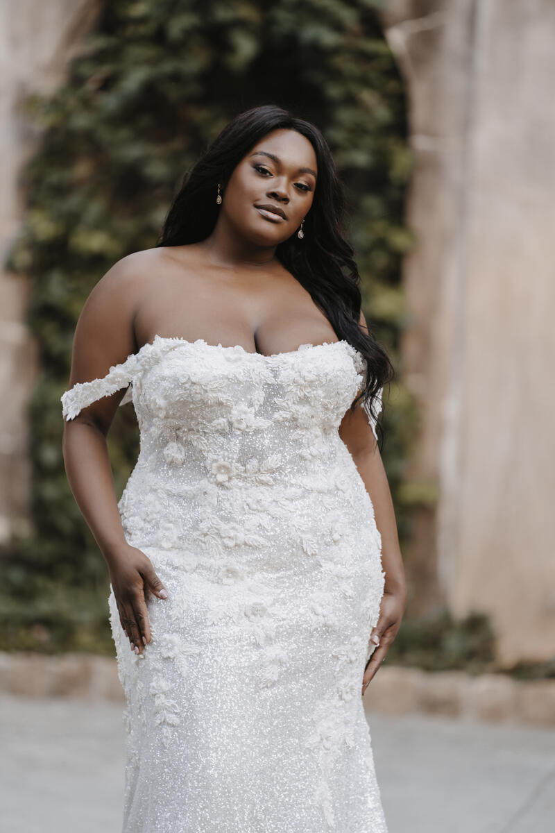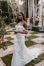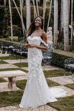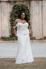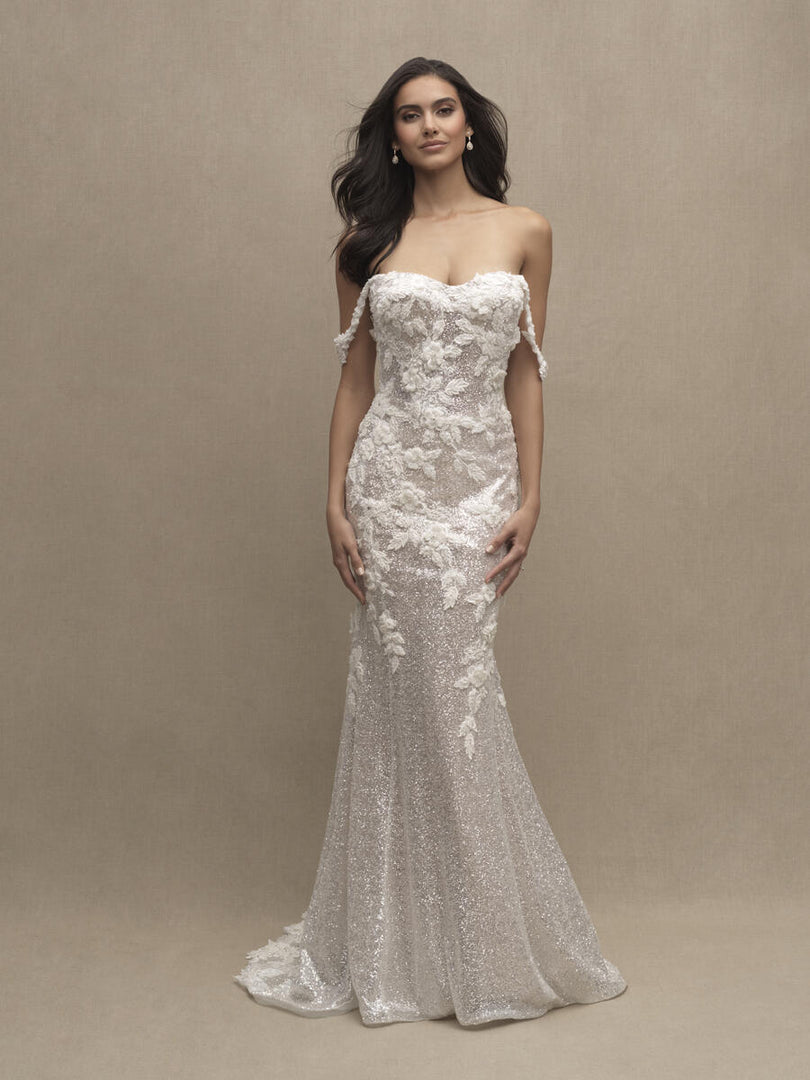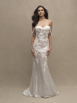 For the bride who is ready to shimmer and shine on her wedding day, this fit and flare bridal gown is style C626 from Allure Couture's Fall 2021 Wedding Dress collection. Intricately beaded lace appliques add dimension to the stunning sequined fabric of this off-shoulder gown, a flattering and fabulous fit for your destination wedding or formal church ceremony. Designed with a sweetheart neckline, we're also loving the detachable off the shoulder addition! Sequins and beads adorn the gown throughout--just perfect for a candlelit dinner or first dance under the stars. Please call our Dallas, Texas location to check in-store availability, pricing and current ship dates.