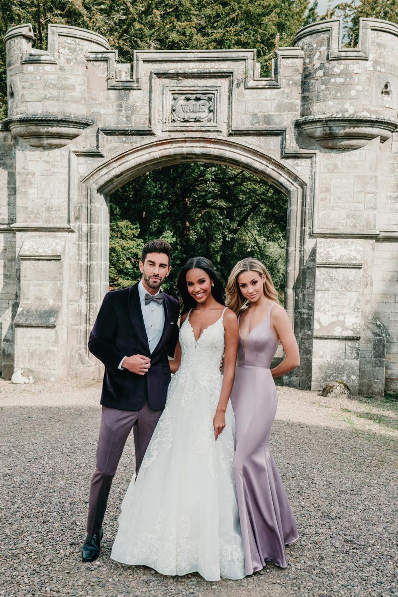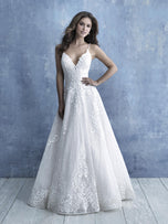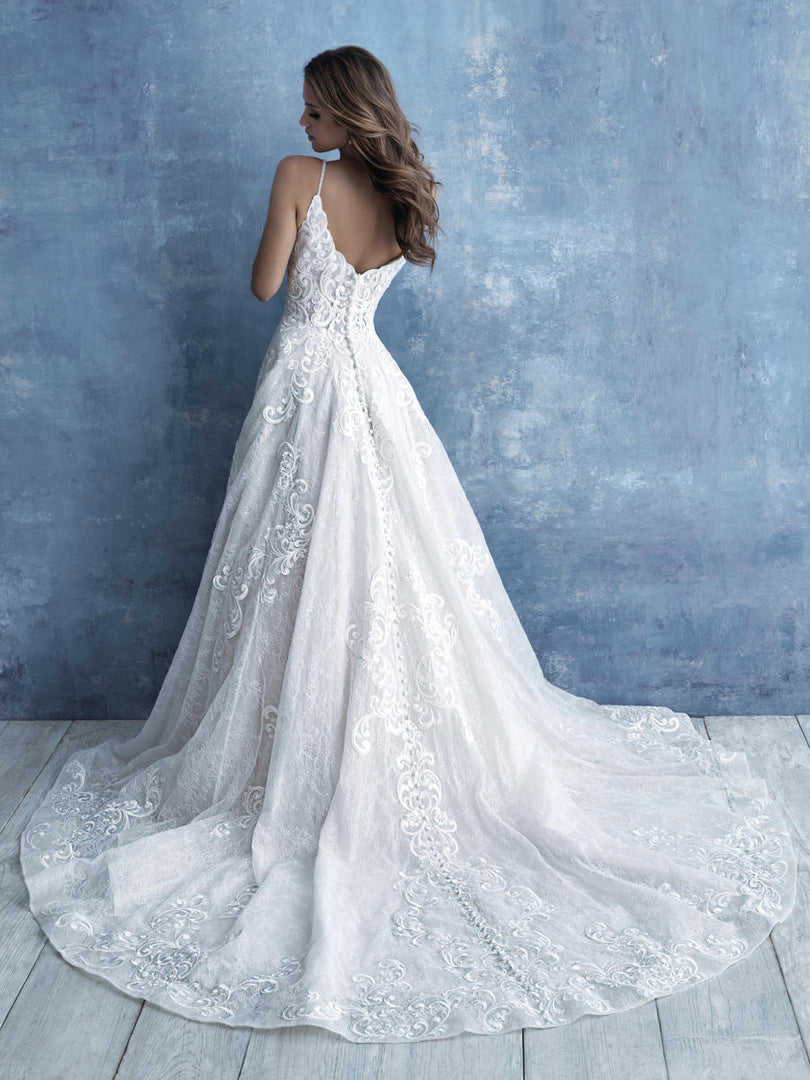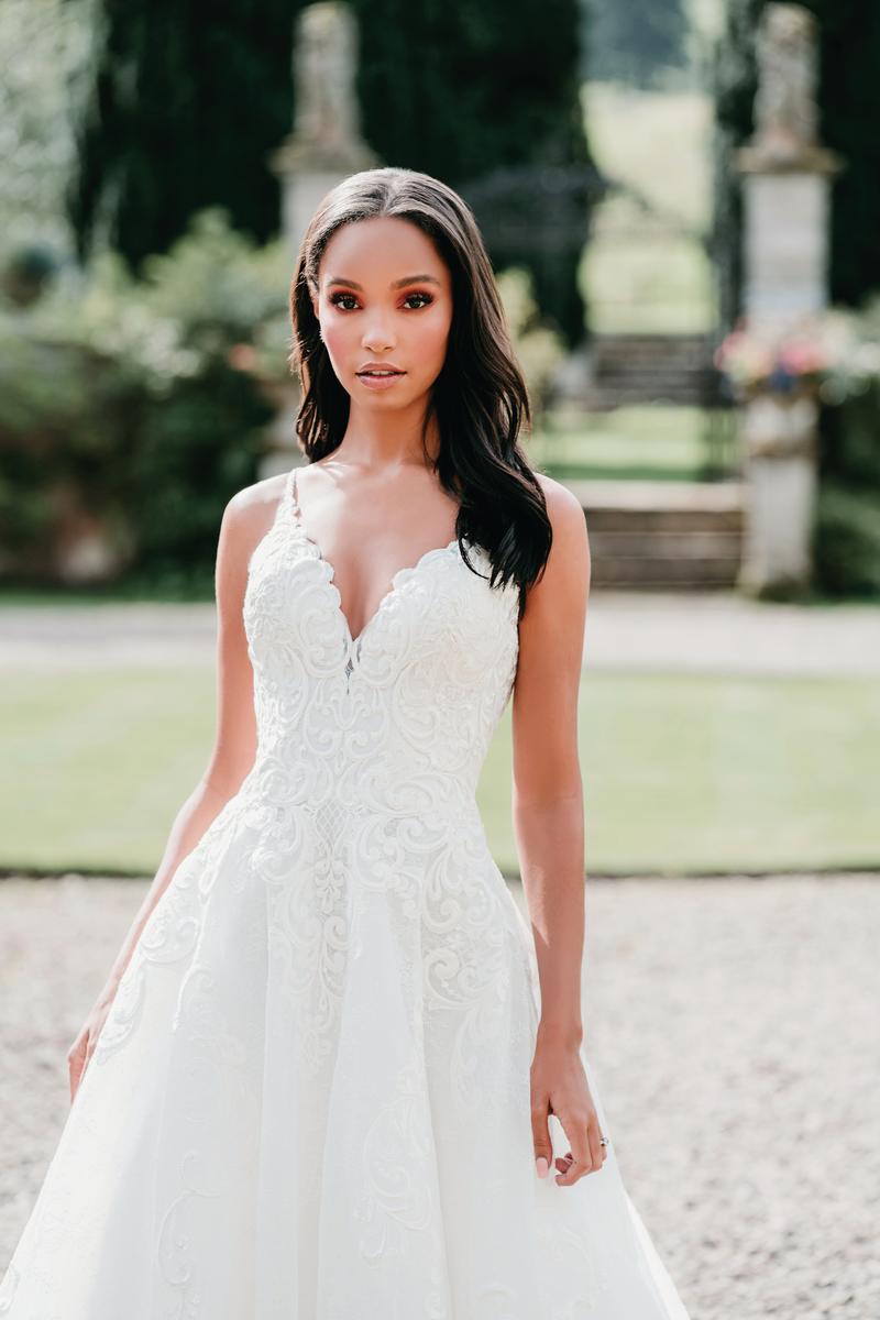 A modern feel to a classic style, this ballgown bridal gown is style 9718 from Allure Bridal's Spring 2020 Wedding Dress collection. Textured sheet lace is topped with appliques along the bodice and hemline of this romantic look, fit for a fashion forward bride at her formal wedding or romantic rustic chic affair. Perfect for an outdoor ceremony, this light and fun look features delicate straps and a sweetheart neckline. A beautiful train and low, open back completes the look. Please call our Dallas, Texas location to check in-store availability, pricing and current ship dates.