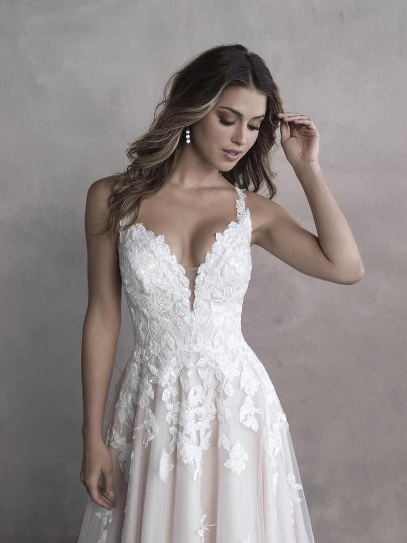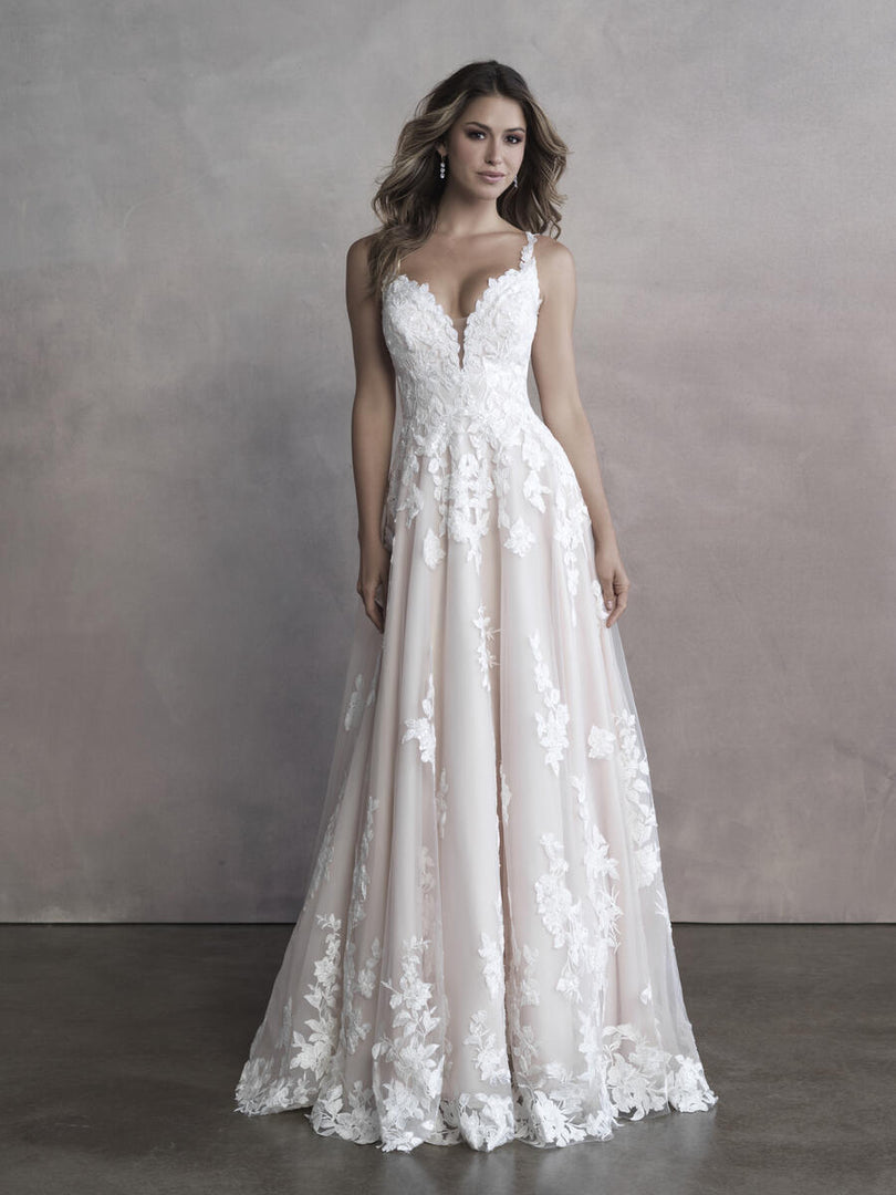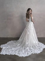 Boho-inspired, fun and flirty, this floral lace look is style 9811 from Allure Bridal's 2021 Bridal Gown collection. The stunning train on this gown gives the illusion of falling blooms and leaves scattered along the aisle, a perfect preset for your destination wedding, whimsical wooded ceremony or outdoor locale. A plunging sweetheart neckline completes the look along with a low back, sure to keep all eyes on you when the big day comes! Please call our Dallas, Texas location to check in-store availability, pricing and current ship dates.