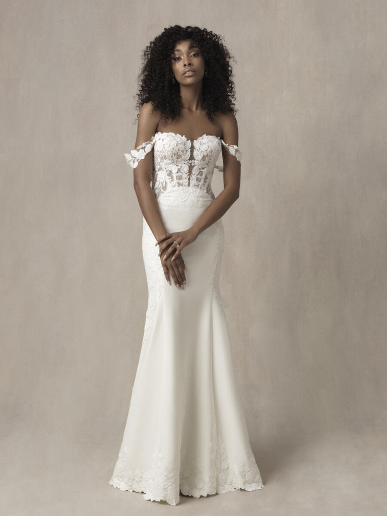 Sizes with an S are 4 inches shorter in length.Stunning, ephemeral flowers adorn the bodice and detachable off-shoulder straps of this sheath gown.