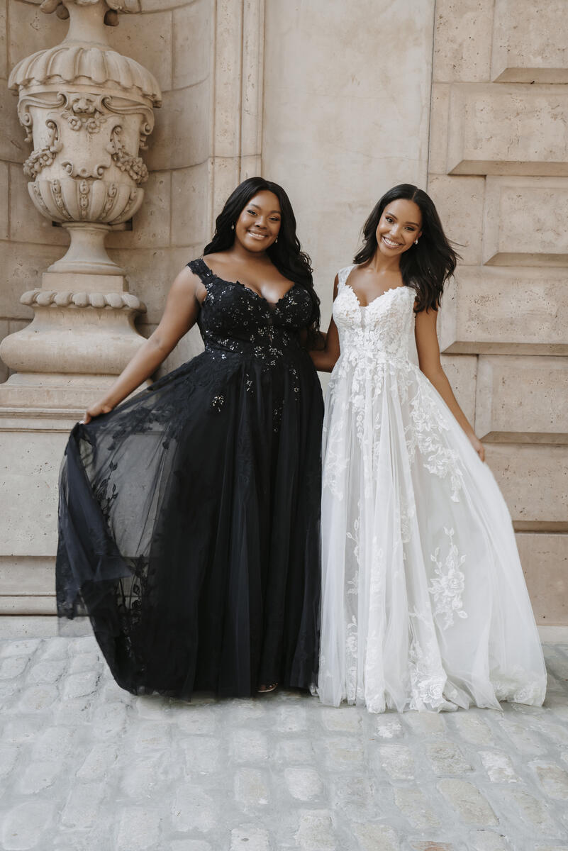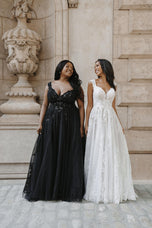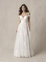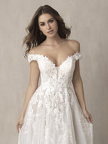 This off-shoulder bridal gown is also available as a black ballgown wedding dress for the boldest of brides! Style 9861 is featured in Allure's Fall 2021 Wedding Dress collection and you'll soon see why it is one of our stylists' faves! Perfect for a fashion-forward ceremony or classic, elegant reception, bouquets of roses trail down the bodice and full skirt, setting atop a sweetheart neckline and completing the elegant, illusion train. Please call our Dallas, Texas location to check in-store availability, pricing and current ship dates.