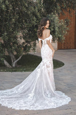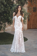 Trend-forward off-shoulder straps and exposed boning along the bodice accent the sequined and beaded lace appliques and Chantilly lace backdrop of this sheath bridal gown.