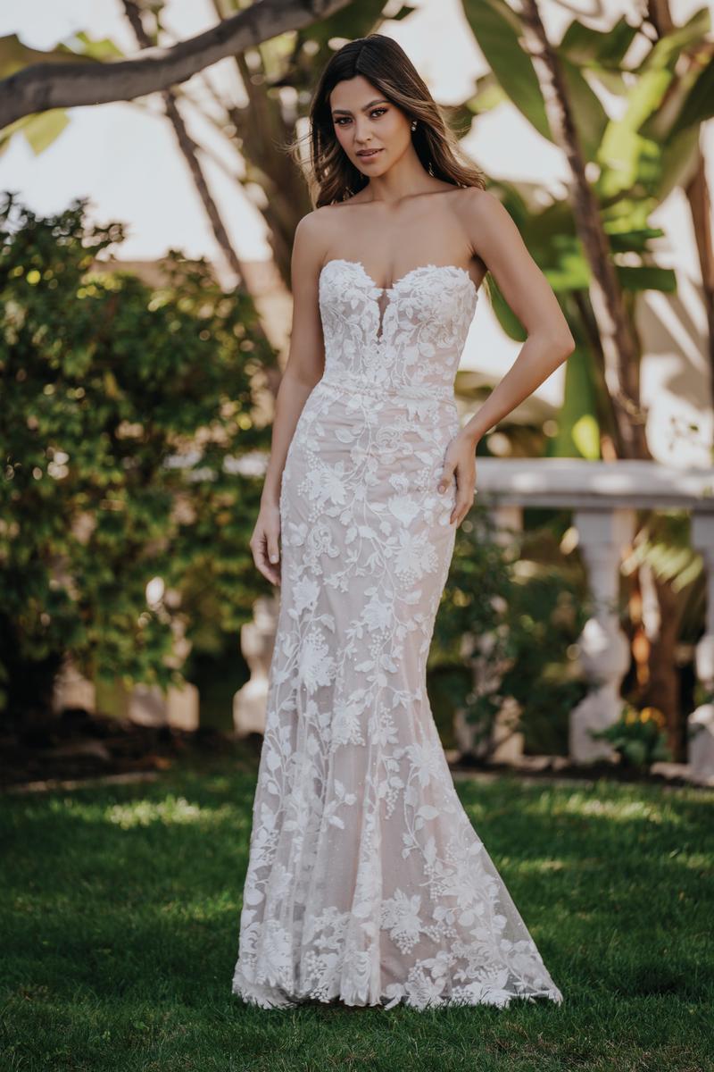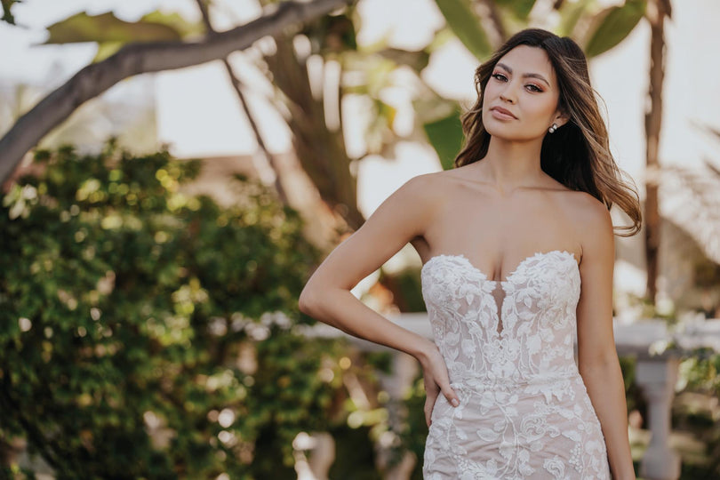 Symmetrical matte lace covers sparkling tulle throughout this sheath bridal gown, style R3651 from the Fall 2023 Allure Romance Bridal Gown collection. Flattering on any body type from apple to hourglass to pear-shaped, she's designed with a strapless, sweetheart neckline and body shaping silhouette. She's even available in shorter lengths for our petite brides, making alterations a breeze! Whether you're planning a romantic outdoor wedding or formal reception under the stars, she's the perfect centerpiece for your aisle style. Please call or Dallas, Texas location to check in store availability, pricing, and current ship dates.