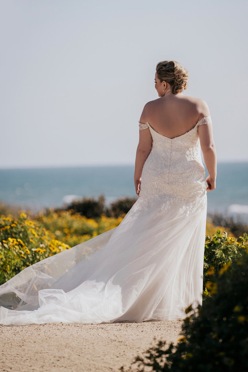 This off-shoulder fit and flare gown is style R3656 from the Fall 2023 Allure Romance Bridal Gown collection. Featuring jaw-dropping sequined lace appliques leading to a sparkling tulle skirt. A stunning silhouette for any body type from apple to pear-shaped to hourglass, she's finished with romantic off the shoulder straps paired with a plunging sweetheart neckline and a stunning, illusion back. She's even available fully lined for a more modest bridal gown look. Please call or Dallas, Texas location to check in store availability, pricing, and current ship dates.