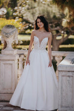 A romantic choice for a traditional bride, this is style R3660 from the Fall 2023 Allure Romance bridal gown collection. A plunging sweetheart neckline, paired with ephemeral detachable off-shoulder straps, make this ballgown an absolute stunner. We're loving the illusion bodice with layers of details that will shimmer under the stars at your outdoor wedding or glitter under the chandelier at your reception. Please call our Dallas, Texas location to check in store availability, pricing, and current ship dates.
