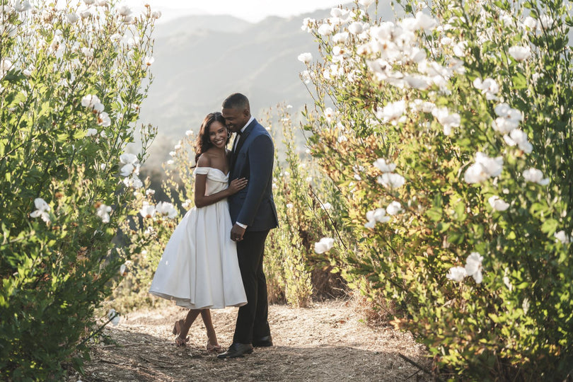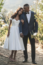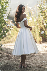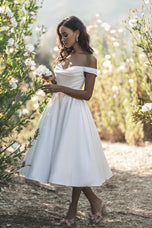A subtle cowl effect softens the elegant off-shoulder bodice of this Mikado bridal gown, which is finished in a vintage-inspired tea length.