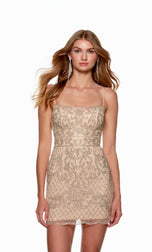 We are dying too see you in this elegant, beaded cocktail dress, style 4660, by Alyce Paris! The straight across neckline adds a modest touch, thin adjustable straps and low scoop back. The intricate beadwork adds a priceless touch!