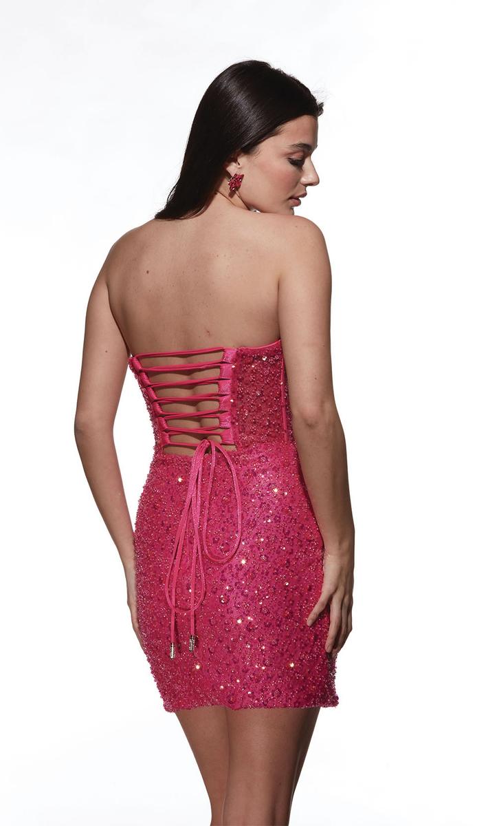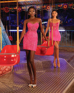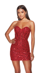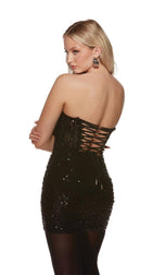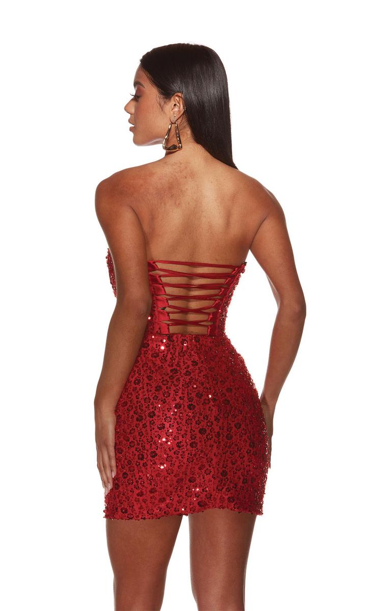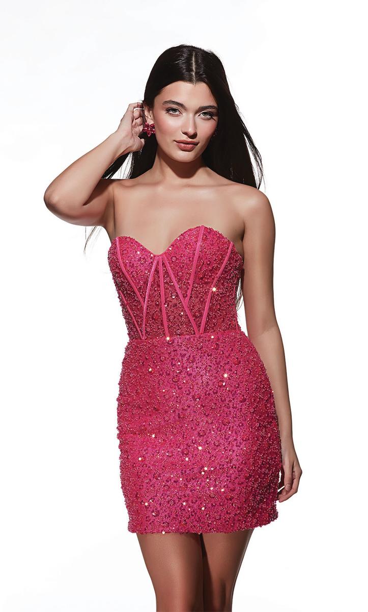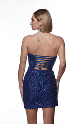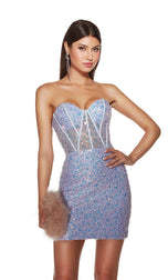 Discover elegance in the Alyce Paris short homecoming 2024 dress. Crafted from shimmering sequin fabric, it dazzles with a sparkly allure. The strapless bodice features a flattering sweetheart neckline, complemented by a chic corset design with a lace-up back, ensuring a perfect fit and a touch of sophistication. Ideal for making a statement on any special occasion, this dress combines glamour with a contemporary flair, promising to captivate with every step.