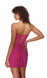 Sparkle and shine in this Alyce Paris homecoming dress (style 4861). This short, formal dress is crafted from luxurious glitter tulle, sure to catch the light as you move. The strapless bodice offers a clean, sophisticated look, while the straight silhouette flatters your figure. The back features a trendy lace-up detail, adding a touch of drama and allowing for a perfect fit. The corset-style construction cinches your waist, creating a stunning hourglass shape. This versatile dress is perfect for homecoming, prom, or any special occasion where you want to feel confident and glamorous!