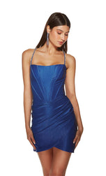 Alyce Paris Homecoming Dress (style 4920) is a unique blend of sophistication and modern flair, perfect for your homecoming or any formal event. Crafted from luxurious shiny jersey that drapes beautifully, the dress features a classic scoop neckline and a flattering straight skirt. The star of the show is the back, with delicate straps leading down to a strappy design and a hidden built-in corset that ensures a perfect fit and creates a stunning hourglass figure. Ruching details and a possible asymmetrical hem add a touch of playful flair, while delicate embellishments might elevate the look further. This homecoming dress, also versatile as a cocktail dress, is an Alyce Paris creation sure to turn heads and make you feel confident and unforgettable!