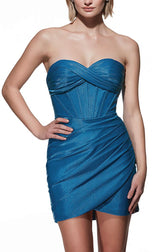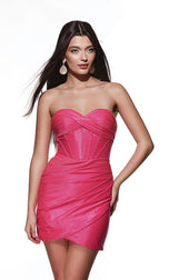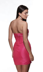 Turn heads with a touch of modern flair in the Alyce Paris Homecoming Dress (style 4921). This short formal dress combines the elegance of a sweetheart neckline with the versatility of a straight skirt, crafted from luxurious shiny jersey that drapes beautifully to flatter your figure. The fabric shimmers subtly, catching the light without overwhelming the design. While some variations might feature a strapless design, this homecoming dress offers the structured support of a closed back. The secret weapon? A built-in corset ensures a perfectly customized fit that cinches your waist and creates a stunning hourglass figure. Ruching details on the bodice can accentuate your curves further. And to add a touch of playful asymmetry, the dress might feature a trendy asymmetrical hem. This versatile dress can also be called a cocktail dress. Whether you call it a homecoming dress or a cocktail dress, this Alyce Paris creation is sure to turn heads and make you feel confident and unforgettable throughout the night!