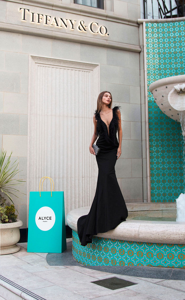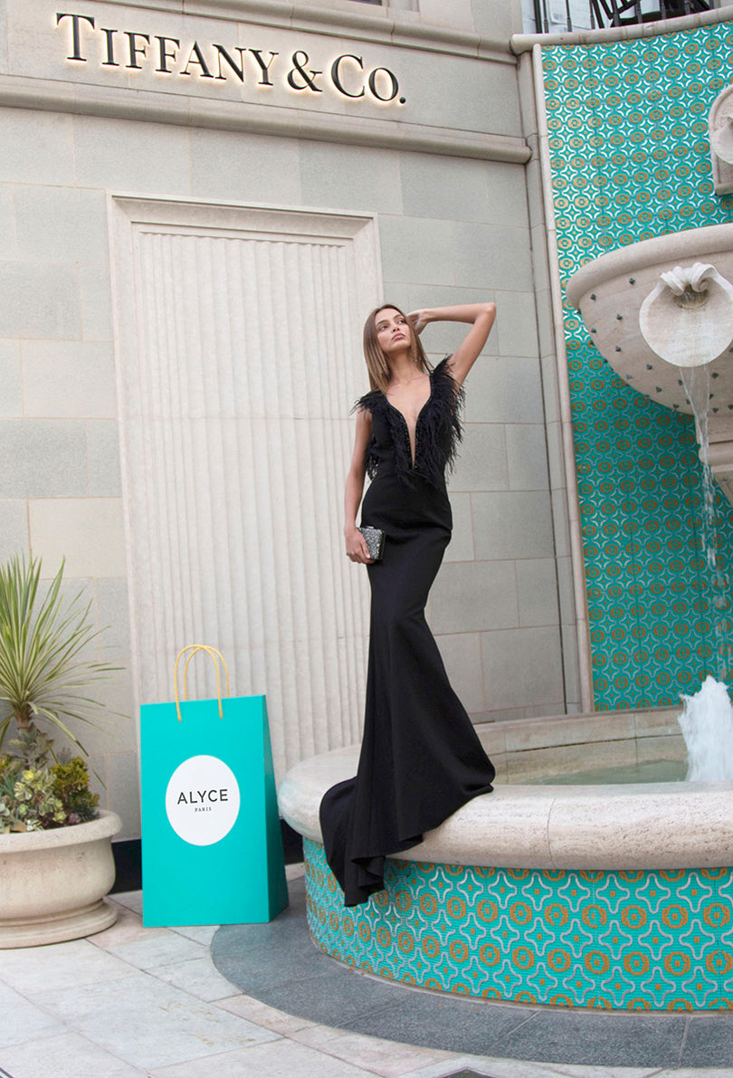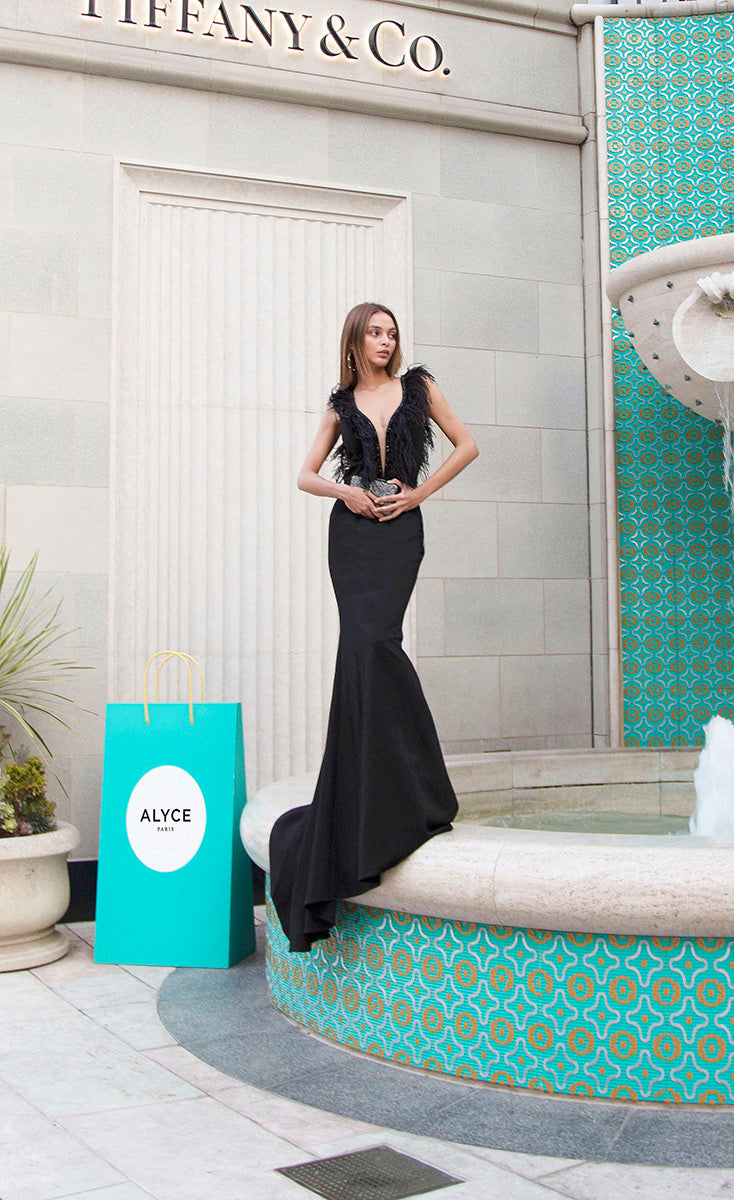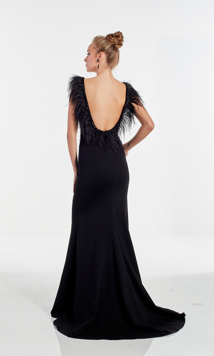 Feel sexy and unique in this form fitting evening gown designed by Alyce Paris. 60905, showcases a beautiful and dramatic feather adorned deep v-neckline with modesty insert. low open back adorned with beading for extra sparkle. The dress is made of jersey material that will showcase your figure effortlessly! The long stunning train completes the look! Perfect for Black-tie, Gala or School Dance!