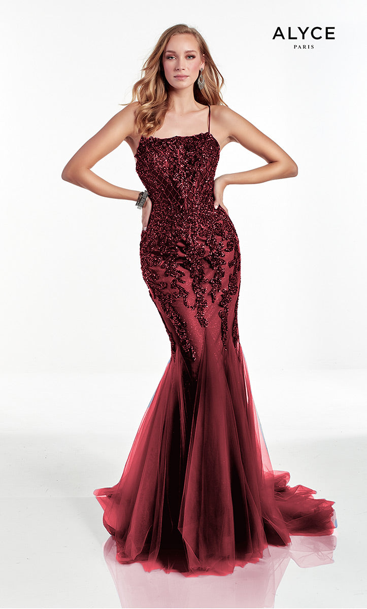 Show off your figure in this glamorous fitting gown designed by Alyce Paris. 60908, showcases a straight across neckline with thin straps that form into an fitting bodice that is fully embellished in beads and sequins. Sparkles of glitter cascade to the tulle skirt. The gown is completed in a sweep flowy train that will sway with every step that you take!