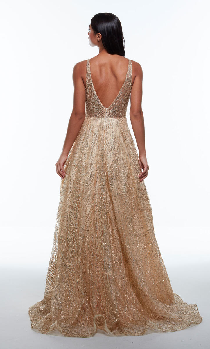 This is the perfect formal gown for Christmas Party, Senior Prom , or Hoco Queen! 61001, is an Aline gown that is fully made in tulle with sparkling glitter! The fitted top has a deep v-neckline with thin straps that from into a low v-back with zipper. The flowy skirt is finished with a sweep train that will sway with every step that you take!