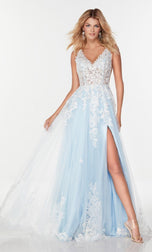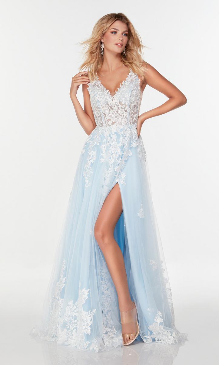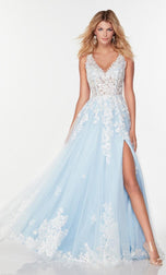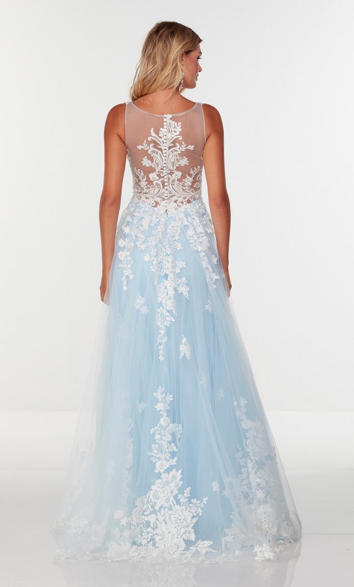 Be the talk of the night in this amazing long aline gown designed by Alyce Paris. 61066,showcases a v-neck, straps that from into an eye-catching illusion back adorned with an lovely lace appliques and button downed. The fitted bodice has lace that cascades to the full tulle skirt and sweep train that will sway with every step that you take!