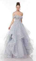 Be the Princess of the night in this stunning long Aline gown by Alyce Paris. 61095, showcases a classy off-the-shoulder sweetheart neckline with cap sleeves. A fitted exposed corset bodice adorned with delicate lace appliques and run into an lace-up back for a snug fit! A unique flowy skirt with ruffles. Perfect for a Ball, Prom or Hoco!