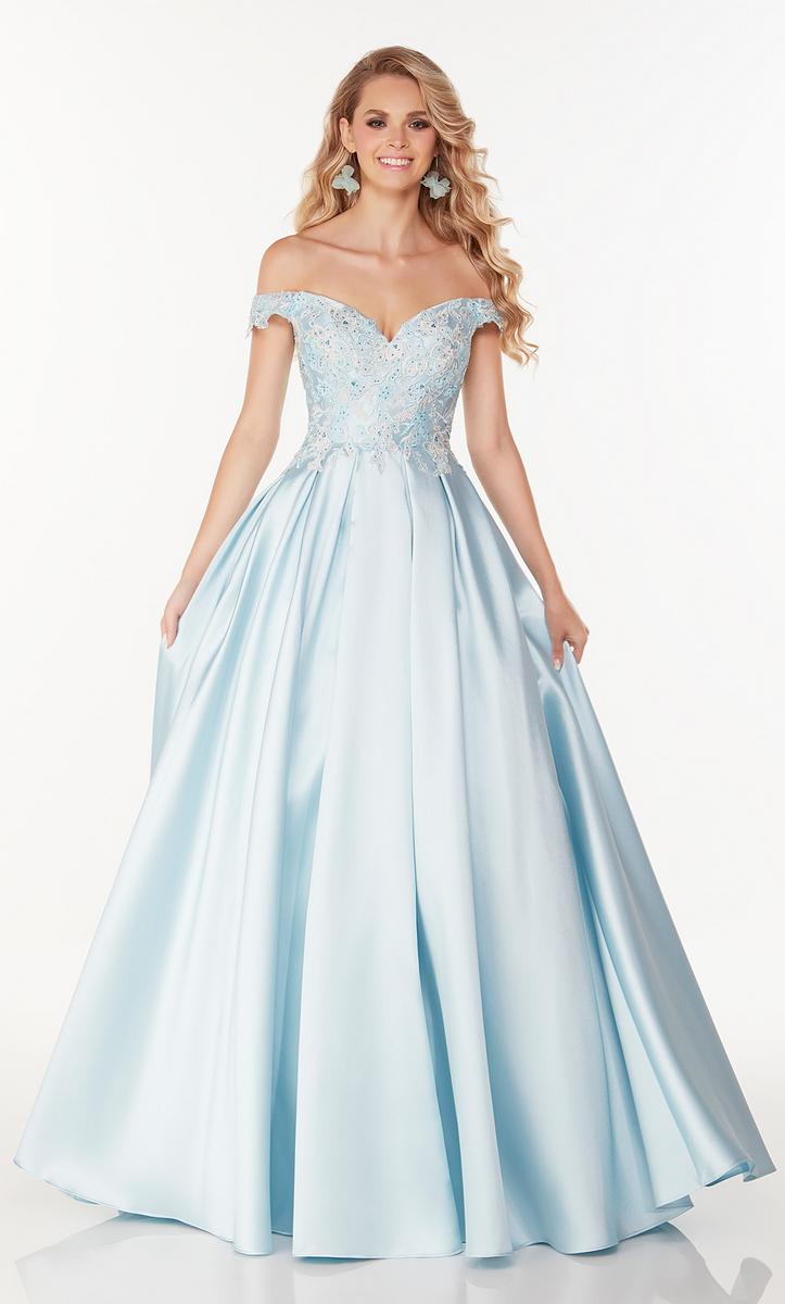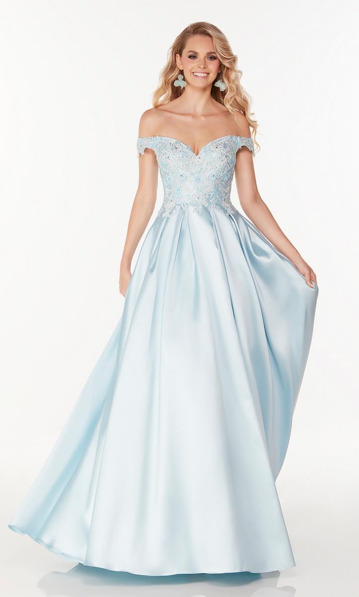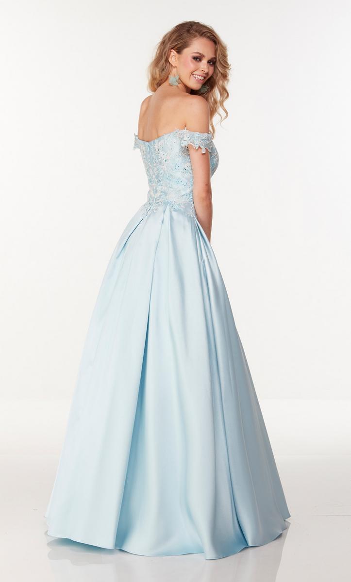 Modest yet classy is this beautiful Mikado Aline gown from Alyce Paris Prom. 61103, showcases a lovely off-the-shoulder neckline. The top is beautifully adorned with floral lace appliqus and cascade onto the mikado skirt. Perfect for any dance or guest of!