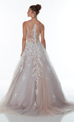 Get all the compliments in this stunning long Aline formal gown designed by Alyce Paris, style 61106. The fully laced top showcases a v neckline with straps that form into an eye-catching illusion back adorned with lace appliqus. The flowy tulle skirt is adorned with matching lace. Make this your go to gown for any special night.