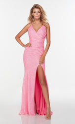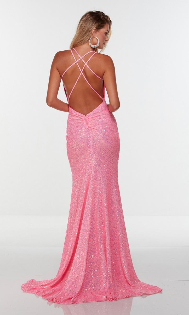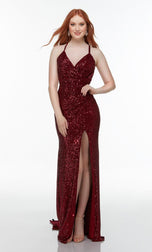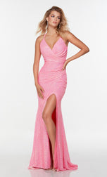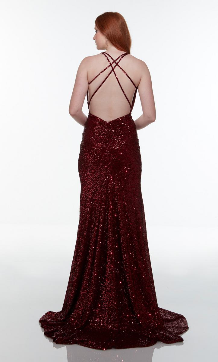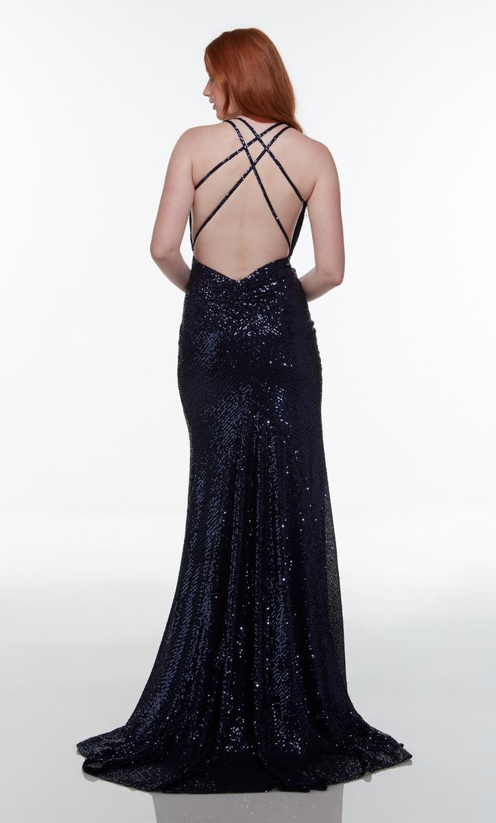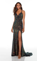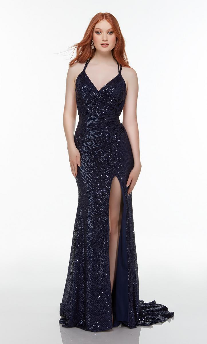 Pure elegance is this formal gown designed by Alyce Paris Prom 2022. 61150, is fully embellished in sparkling sequins. A v-neckline, thin straps and lace-up back. The fitted gown is finished with a front leg slit for easier movement and sweep train that will sway with every step that you take!