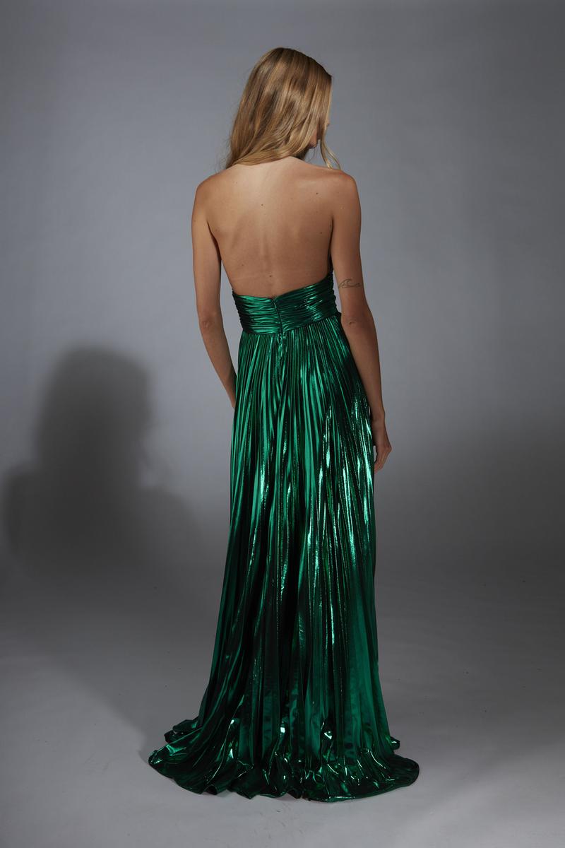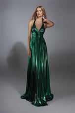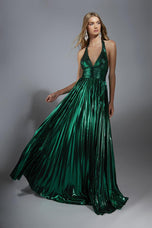 A spotlight moment feels guaranteed when you glide in wearing this emerald dream that looks straight out of Wicked in the best way possible. The halterneck and deep V-neckline create a flattering shape that feels both romantic and powerful, like you just landed in Emerald City, ready to take the lead role. The shiny metallic foil fabric catches every bit of light, making you look insanely stunning without even trying. The whole look gives queen energy with a soft, flowy finish that makes every step feel like a dramatic reveal.A dress like this knows how to make an entrance, especially with its silky movement and mini train that sweeps behind you like magic. The open back adds a modern twist that blends sleek elegance with a bold little surprise. Every swirl of the skirt feels effortless and picture perfect, turning even a hallway walk into a red carpet moment. If you want a long dress that is romantic, flattering, shiny, and absolutely unforgettable, this Alyce Paris look is your emerald era.