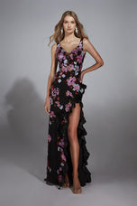Shine in the stunning Alyce Paris long dress from the Spring 2025 Prom collection. This fitted silhouette is crafted from dazzling sequin fabric, perfectly designed to catch the light as you move. The v-neckline, framed by two thick straps, adds a touch of elegance while keeping it fun and youthful. A romantic ruffle-lined slit enhances the dress with a delicate flair, creating graceful movement with every step. Covered in a mesmerizing floral pattern, this gown channels a dreamy garden-inspired look, perfect for a magical prom night. Be bold, beautiful, and unforgettable in this captivating Alyce Paris design.