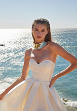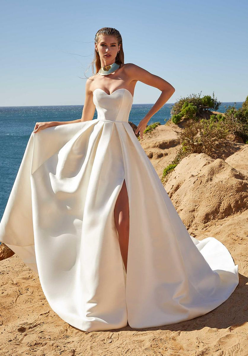Our Marjorie designer wedding dress is a dramatic ball gown with simple details. The silky Larissa satin gown has a strapless, sweetheart bodice with textural seams for added dimension. The pleated A-line skirt is voluminous, with a grand feel and a daring skirt slit for a modern design element. Buttons down to the hem are a timeless touch making this a truly classic ball gown. Shown in Ivory.