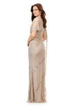 This stunning evening gown is complete with an intricate bead motif. The bustier is adorned with an asymmetrical overlay which falls down the left arm..