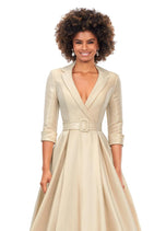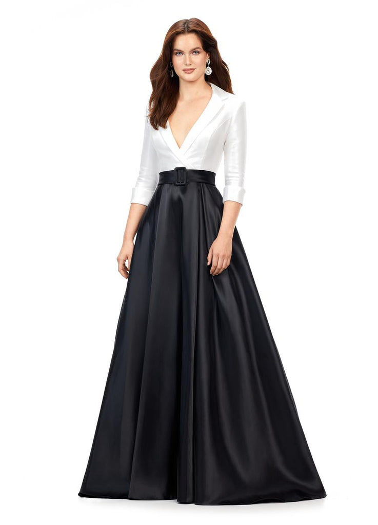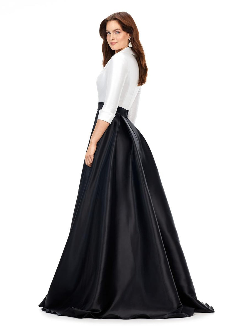 This stunning satin ball gown features a v-neckline. The bustier is complete with a wrap lapel that gives way to a buckled belt. *pssst...it also has pockets!*