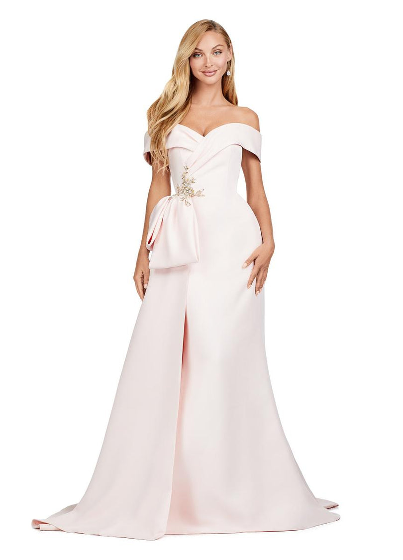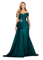 An elegant off the shoulder neckline drapes the shoulders in elegant evening gown. The look is complete with beaded details and a side overskirt.