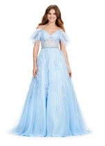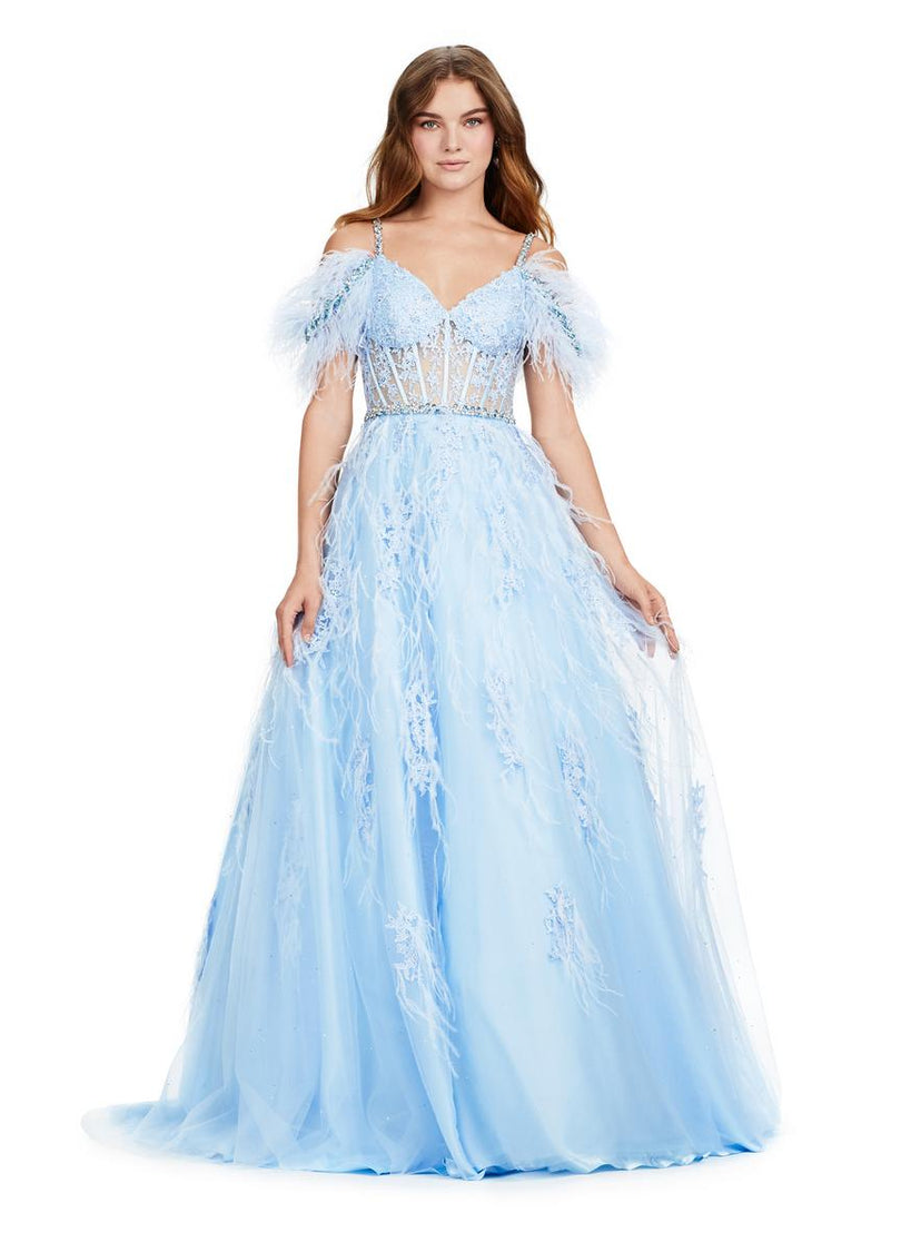 The perfect balance of whimsical and dreamy! Stand out in this beaded bustier, exposed boning bodice and feather accents. This gown will make you feel like a queen!