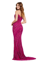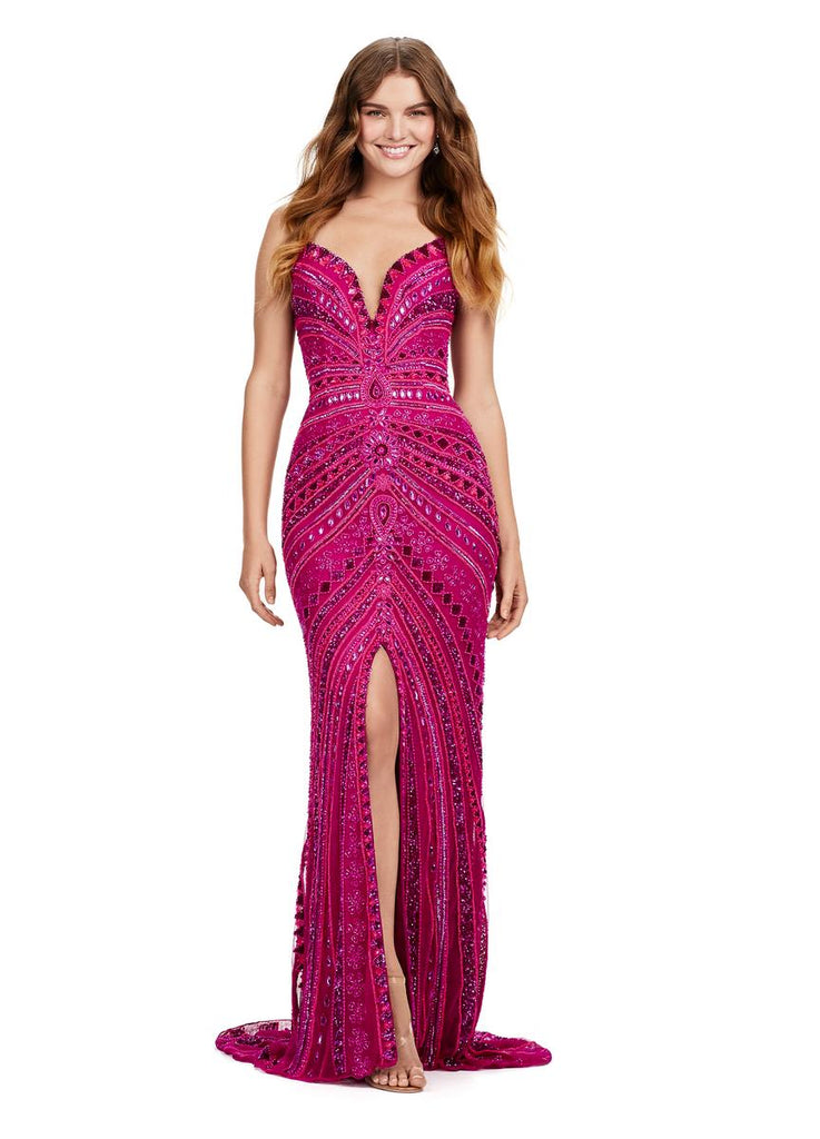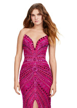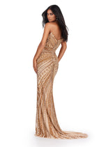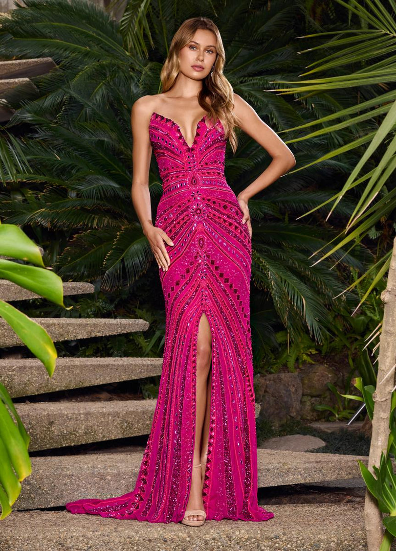 All eyes on you in this fabulous strapless gown! This fully beaded dress features a center slit and an intricate beaded pattern.