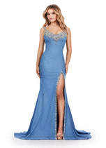 Let the spotlight come to you as you step foot into the room showcasing this phenomenal gown, style 11515, by ASHLEYlauren from Spring 2024. This slim fitting gown displays a soft v neckline with mesh detail adorned in high quality beading that flows onto the straps and low back. The fitted skirt is completed with a side leg slit with matching beading and sweep train. Perfect choice for Gala, Prom night, and so much more.