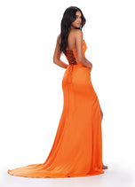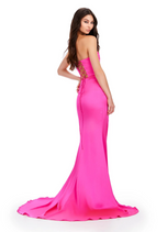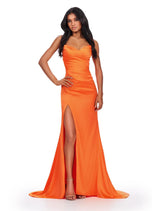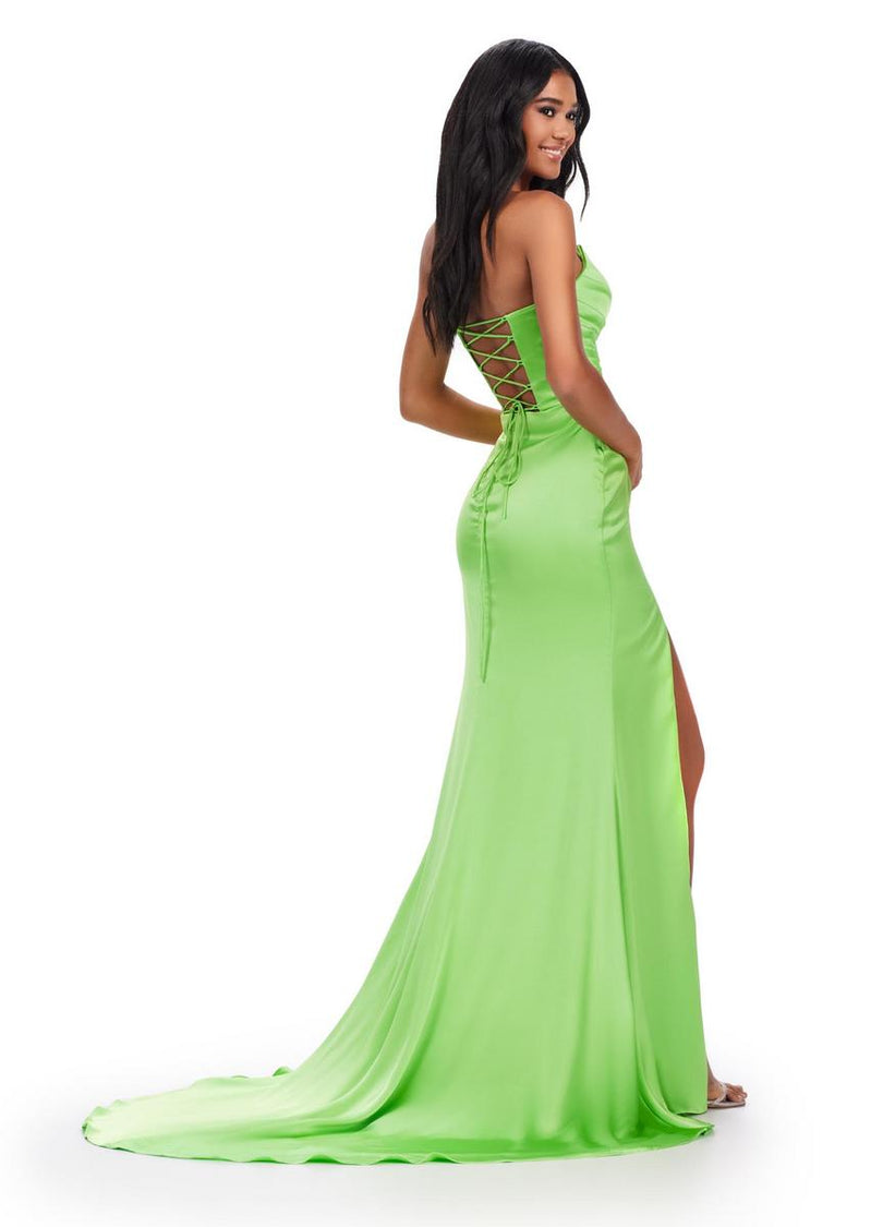A timeless classic! This strapless satin dress features ruched detail throughout. The lace up back and right leg slit complete the look.Look no further Terry Costa has you covered with this timeless gown designed by ASHLEYlauren, style 11605, from Spring 2024 Collection. This gown is created in rich satin fabric that will hug on your figure perfectly. A strapless v neckline with ruching on the fitted top. The fitted skirt is completed with a sexy side slit and sweep train.