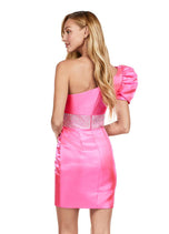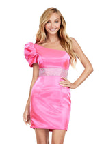 Shine bright in this satin one shoulder cocktail dress. With gorgeous beading at the waist and an oversized puff sleeve, you'll be the talk of the town!