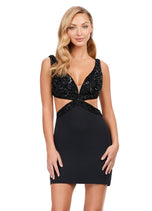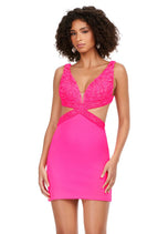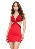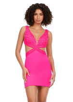 Show off your fun and flirty side in this gorgeous cocktail dress. With its perfectly placed cutouts and lace-up back, this jersey gown is perfect for any event!