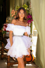 Step into elegance with the Ava Presley's Style 29130 Short Dress for Homecoming 2024. This classic A-line silhouette features off-the-shoulder puff sleeves and a charming square neck, creating a timeless and unforgettable look. Crafted from delicate tulle fabric, the dress boasts fluffy layered ruffles that add a touch of whimsy and volume. The standout feature is the sparkling rhinestone waistband, which cinches the waist beautifully and adds a glamorous touch. Perfect for making a statement, this Ava Presley's dress combines sophistication and playful charm, ensuring you shine all night long at homecoming!