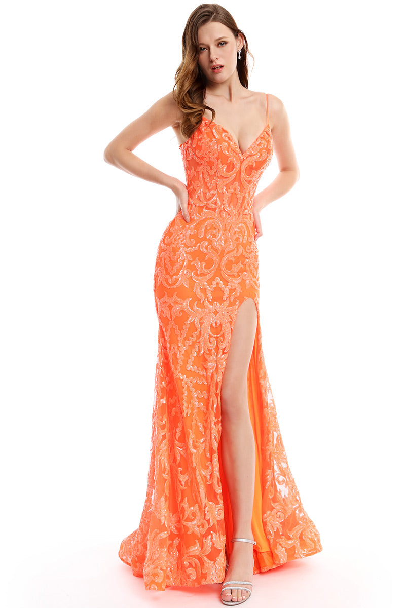 Introducing Ava Presley's Style 36004, a dazzling creation perfect for your special event. This gown features a sleek corset bodice that accentuates elegance and sophistication. The high slit and captivating V-neck effortlessly blend allure with style, ensuring a memorable entrance. Whether it's for prom or an enchanting evening affair, this dress embraces fun and flirtatiousness, promising a look that's both chic and captivating. Step into the spotlight and make a statement at Prom 2024 with this exquisite ensemble by Ava Presley.