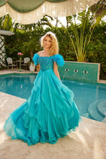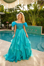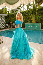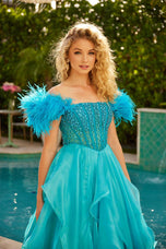 Make a show-stopping entrance in the Ava Presley 39553 prom dress! This stunning ballgown features an off-the-shoulder design with delicate feather sleeves, perfectly balancing elegance and drama. The fitted, corset-style bodice is embellished with sparkling details that catch the light from every angle, while the basque waist creates a flattering silhouette.The ruffle skirt flows with movement and volume, adding playful flair to this sophisticated gown. Perfect for prom, homecoming, or any special occasion where you want to feel glamorous, confident, and unforgettable!