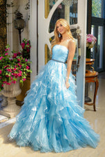 Turn heads and steal the spotlight in the Ava Presley 39555. This stunning strapless ball gown is a dream come true for any formal occasion, from prom night's grand entrance to pageant stages and homecoming courts. The classic ball gown silhouette flatters every figure, with a tiered ruffle skirt that adds a touch of playful whimsy. The ruched bodice creates a flattering and supportive fit, while the beaded waistline adds a touch of sparkle. Ava Presley 39555: where timeless elegance meets modern romance. Be the unforgettable star in this prom dress, pageant dress, homecoming dress, or any other special event! Let this gown make your grand entrance unforgettable.