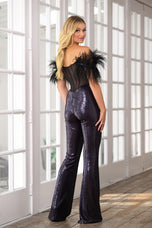 Step into the limelight with the "Ava Presley" jumpsuit, a dazzling fusion of retro glam and contemporary flair. This sensational piece is a nod to classic Hollywood with its feathered off-the-shoulder straps and sleek corset bodice, perfect for Prom 2025. Crafted from shimmering sequin fabric, it catches the light with every move, ensuring you're the star of the party. The spunky, flared pants add a playful twist, promising to make heads turn as you dance the night away. Embrace your inner diva and make a statement in this unforgettable ensemble that blends sophistication with a touch of whimsy.